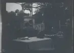"Tora Samuelsson, Elsa Råstedt, Fogelstad gårdshushåll" Två utklädda kvinnor håller varsin bok/ bibel.