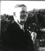 "Anders Gustavsson, Skene, f d elev. Från folkskolan i Åhs. Bilden hör samman med artikel i Hallands Nyheter, 1944-08-09, "Från skoljubileet i Tvååker: Rottingen i lärarens hand ett erkänt uppfostringsmedel". Tillhör samlingen med fotokopior från Hallands Nyheter som är från 1930-1940-talen."