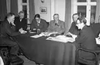 Tre män och en kvinna. Männen står bakom den sittande kvinnliga ordföranden. På bårdet ligger styrelsepapper. Ciggarer i låda och cigaretter i kopp står på bordet. I bakgrunden syns Isaac Grünewalds monumentalmålning "Morgonrodnad".