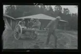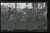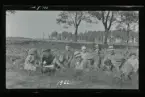 Picknick under Arbogautställningen 1935. Sju kvinnor och en man sitter på mattor utlagda i gräset. Avkoppling i Ahllöfsparken/Olof Ahllöfs park nära Arbogautställningen. De har kafferast i förberedelsearbetet inför utställningen. Från vänster: Sven Drakenberg (intendent), Britta Orén, Olga Anderzon (från hemslöjdsföreningen), okänd, längst bak, i hatt, Hanna Hartelius, Ulla Hermansson, Augusta Eriksson och Elin Höglund (konstnärinna) Bildens baksida, se AKF-14500 Bilden är tagen av fotograf Blom i Västerås (förnamn saknas)