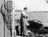 Lantbrevbäraren Sven Eriksson, Ljusterö, tillsammans med sin fru Anna hemma på Lagnö Ö. Brevlådan på husknuten berättar att här bor lantbrevbäraren. Ljusterö, Lagnö Ö, Sverige. Fotat 6/6 1963.