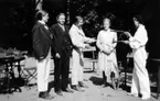 Två unga män leker polis i skogen.