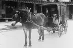 Chaufför Gustav Jarneving ute på dagens första filial-, bunt- och expresskörning. Bunt till traktens brevbärare avlämnas här i porten till Björkhultsvägen 11A.