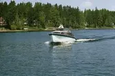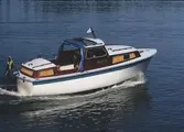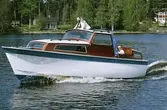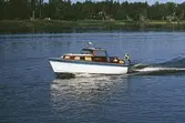 Man (troligen anställd vid Albin Marin) vid styrplatsen på en prototyp till Albin 25.