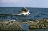 Prototyp till Albin 25 förtöjd i en vik. Badande män i vattnet.