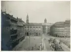 "Ett torg i Dresden, sett från hotell Rone". Vy över ett torg (Neumarkt) med spårvagnstrafik m.m.. Tilll vänster ser man en del av "Johanneum" (fd hovstall m.m.). I bakgrunden ser man bl a kyrktornet till Hofkirche.