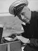"Ombord på 'Gerdny' under Sandhamnsregattan 1918" [intill mannen längst t v:] "Gust Berglund" [nedanför mannen t v med mörk mössa:] "Georg Wrange" [intill mannen med vit mössa i sittbrunnen:] "Harry Bergvall" [intill mannen längst t h:] "Persson"