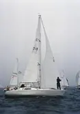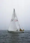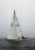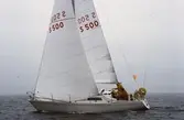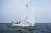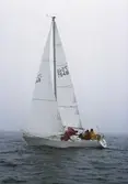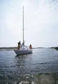 Två män i sittbrunnen på en Scampi 30 vid en brygga.