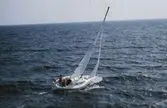 Tre män äter en måltid på en klippa. I bakgrunden en förtöjd Scampi 30.