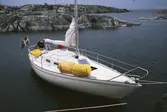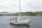 Tre män i sittbrunnen på en Scampi 30 vid brygga.