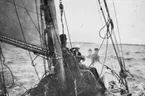 Medföljande text: "Bohusjulle, 16,5 fot, köpt av Wictor Carlsson, Örn, år 1929. Jullen förmodligen byggd på Orust på 1860-talet. Främre delen av jullen byggd i ek, bakre av fura. Wictor Carlsson återställde jullen i ursprungligt skick vid köpet (riggen dock ej ursprunglig). Seglen sydda av Limboms i Lysekil. Jullen ägdes av Wictor Carlsson till ca 1950. Bilden tagen i Tullboden, Sotenäs, årtal okänt. Originalfoto tillhörande Wiktor Carlsson, Örn, PA Kungshamn".