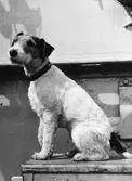 "Pansarskeppet Victoria [sic] 1944, kommendör Anders Forshell, fartygschef" "Skeppshunden Nicke" "Fr. v. Birgit Forshell Margit Forshell, gift Reuterswärd Barbro (Babs) H:son Ericsson"