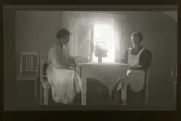 "Sommargäster vid Herrkärr, Fogelstad" Två kvinnor sitter och läser vid ett bord i ett rum.