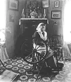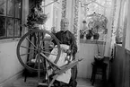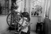 Jordbrukare Agnes Gustafsson vid spinnrocken, Jutbol, Rasbo