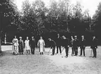 Män och kvinnor spelar krocket framför hus på Lidingö.