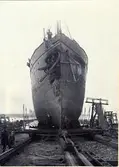 Isbrytaren Sankt Erik i torrdocka på Beckholmen, Stockholm. Den s k åmningen i stäven visar antalet decimeter till kölens underkant.