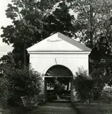 Konfirmandgrupp utanför Idala kyrka. En stigport leder in till kyrkogården.