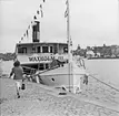 Södra Blasieholmshamnen. Pingstresenärer kliver på skärgårdsbåtarna Saxaren, Gillöga och Rödlöga.