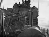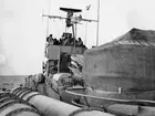 Ubåten Hajen är på väg upp till Vänern. Bilden visar ubåten i sluss 1975