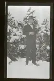 "Trädgårdsarbetare, Fogelstad" Porträtt av en ung man ståendes ute i snön.