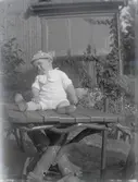 TVÅ SYSKON VID ETT TRÄDGÅRDSBORD