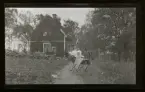 "Bergåsa skogvaktarbostad" Ett litet barn sitter i en barnvagn som står trädgårdsgången fram till ett hus.
