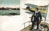 Vykort på militärt område i Karlskrona och även en sjöman som står och pekar mot fotografiet.