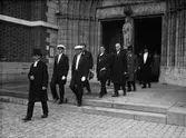 Kungligheter tar emot uppvaktning från Uppsala Studentkår på Universitetshuset trappa - kronprinsessan Louise, kronprins Gustav Adolf, kung Gustav V, prins Eugen, prins Carl, prinsessan Sibylla, prinsessan Ingeborg och rector magnificus Thore Engströmer