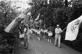 "Saeby's Garden på marsch mot Lions traditionella loppmarknad i Lindome." Almåsgången i Lindome, år 1983. För mer information om bilden se under tilläggsinformation.