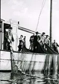 Bildtext till kopian i fotoalbumet: "Vadkast vid Släggö slutet av 1800-talet. Vid kassen: Axel Russberg f. 1857. Vid masten: Henning Abrahamnsson f. 1876. Övriga bl.a. Johannes Adersson f. 1869, Amandus Svensson f. 1862, Karl Olsson" (Olle Hinrikes Karl) f. 1885, Henrik Östensson f. 1844 Övrig okända".