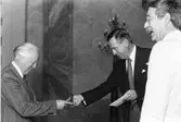 Barn på konstutställning 12 april 1966 En liten flicka klädd i klänning med volang och knappar i ryggen står bredvid en kostymklädd man inne i en konstutställningslokal. En bonad och en tavla hänger på väggen. Till höger i bakgrunden syns en dam klädd i kappa och hatt. or. Han går nedför en kort trappa utomhus.