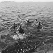 Kvinna i baddräkt på en Albin Viggen. I vattnet en badande man med solhatt.