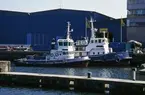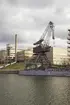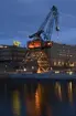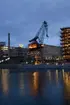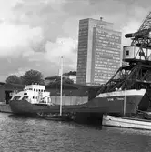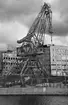 Hammarbyhamnen fyller 25 år. Rörupplag, kolkranar. Längs kajen ligger Olaus Olssons och Wahlman - Hähnels stora kolupplag omgivna av magasin och industrier.