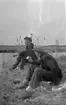 SJU MÄN OCH EN KVINNA DRICKER KAFFE I GRÄSET. EN MAN SPELAR FIOL.