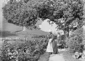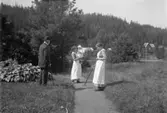 EN MAN SKRATTAR GÅRDSPLANEN, TVÅ KVINNOR TITTAR PÅ.