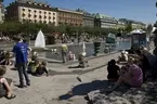 Vårbild från Kungsträdgården. Människor som slagit sig ner på bänkar.