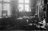 Hålahult sanatorium, interiör, en man sitter och skriver vid ett bord, laboratoriemiljö?