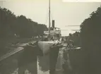 Text till bilden: "Ångbåt med trälast på däck".