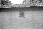 Ett luckskydd tillhörande vedspis står lutat mot en vägg.