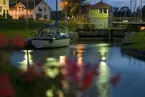 Nattlig utsikt över Strömmen, Saltsjön mot Djurgården med krigsfartyg som är belysningsdekorerade.