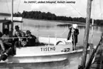 Hej, hej vi ses igen, vinkar Wilhelm Grönqvist! Fyra personer i båt på väg ut på sjön.