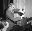 Ett antal män och enstaka kvinnor sitter vid bord på Ribbargården och lyssnar till en föreläsning. En man står bakom ett bord med en diaprojektor.