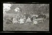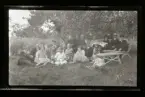 "Vid Askö i Österåker" Grupporträtt av ett sällskap ute i en trädgård. Några sitter i gräset, andra sitter på trädgårdsbänkar kring ett bord dukat med kaffe och kakor.