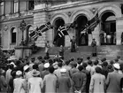 "Stor uppslutning i Upsala kring syttendemaifirandet" - fanborgen med norska flaggor på Vaksala torg, Uppsala maj 1942