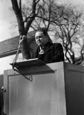 "Stor uppslutning i Upsala kring syttendemaifirandet" - professor Fredrik Paasche talar från universitetstrappan, Uppsala maj 1942