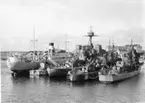 Hamnen. Utsikt över hamnen från västra hamnarmen. Th varvets utrustningskaj på pålar. därinnanför slipen och bakom vinschhuset skymtar byggskjulets tak. Skåne, Malmöhus län, Viken.