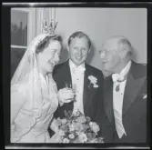 "1680 Bröllop i luften med Abas DC-4 ""Sunnan"" till Paris " Vigsel ombord på ett flygplan. Brudpar står framför präst.