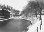 Motiv från Nykvarn med blicken vänd mot bindgarnsfabrikens byggnader på åns östra sida. Närmast ses fördämningen av Stångån som kom till och var nödvändig för anläggandet av Nykvarns sluss och vidare Kinda kanal.
