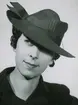 Modell i hatt, hög, mjuk kulle, mjukt brätte, nedragen över ena ögat.