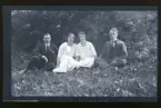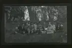 "Råby, Gimmersta familjen Nyström." Ett sällskap sitter utomhus i gräset.